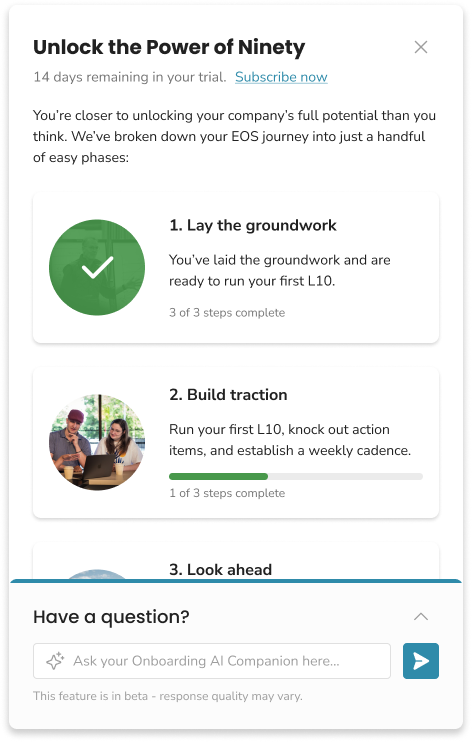 Typically, an EOS coach (Implementer®) is essential to learning the EOS framework and, by extension, getting value of Ninety. Self-implementation proves difficult, if not impossible, for a lot of businesses. By observing interactions and conducting interviews with self-implementers in the trial period, it was painfully obvious that they struggled to adopt the Ninety suite and often did not convert to paid as a result.