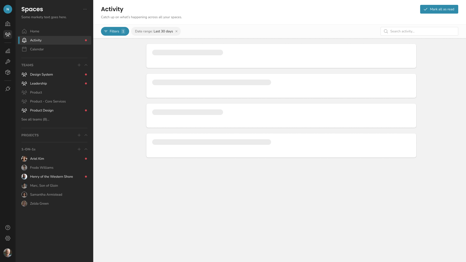 A prerequisite for actually interacting with the team selector was being in more than one team. With that in mind, I conducted segmented user research for users that matched the criteria – folks whose team count was > 1. The research consisted of database queries, session observation and 30-minute customer interviews. In my findings, it became apparent that involvement in more teams equaled more engagement, and more engagement equaled more frustration. Customers wanted to be able to move between teams seamlessly, and see activity across all their teams on a higher level. The answer was clear – teams (or, in broader terms, 'spaces') needed to exist as a higher-level navigation element, not a filter within a page.