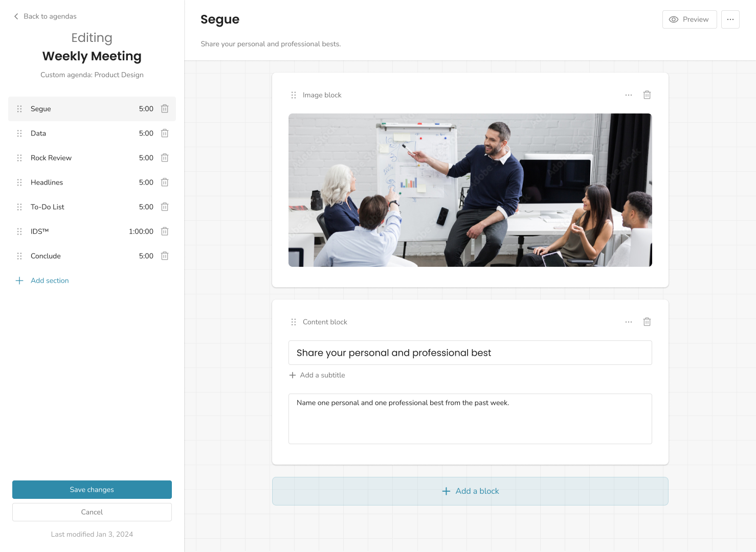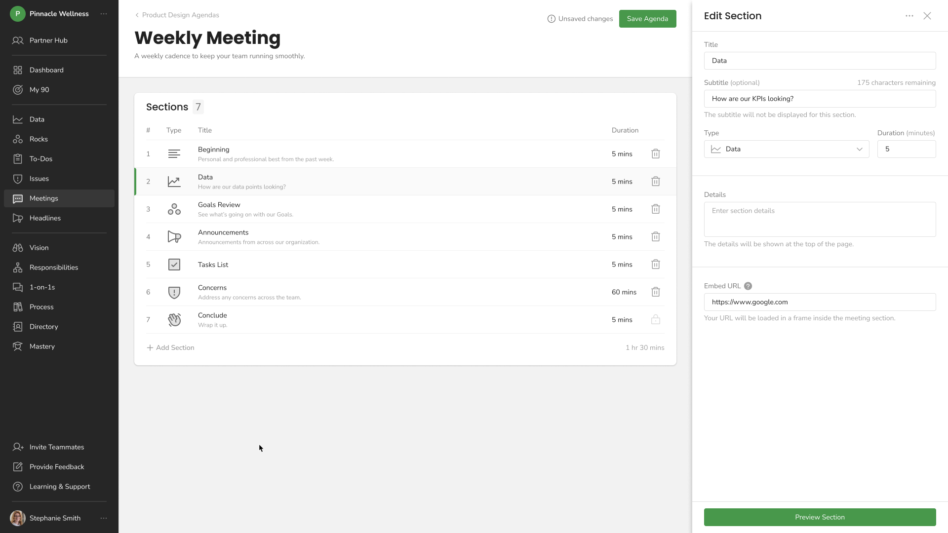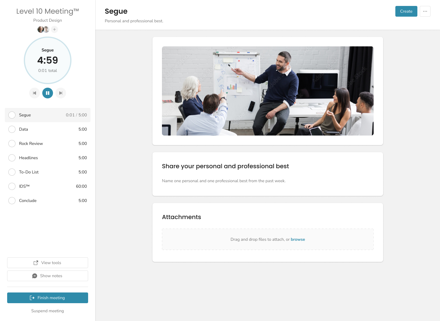 I’d already redesigned the in-meeting experience: lucky for me, my designs could now scale even further. All three aforementioned features were meetings at their core, and the way users were meant to interact with them matched the ‘meetings’ mental model. I immediately recognized the need for a consistent agenda view that had two distinct modes: a template builder and an in-meeting view. Both would consist of a left sidebar that would surface high-level info about the meeting and house the section-based navigation structure, with the right area dedicated to the section the user or team was currently on. While the engineering team was working on backend architecture for multiple meeting participants, I led the design team on a journeymapping and design ideation exercise to identify specific similarities between Meetings, Discussions and Check-Ins, and then converged the findings into a cohesive layout that ended up scaling not only to the three aforementioned tools, but also a different feature that focused more on content management (with the removal of the timer and the ability to add/modify sections on the fly).
