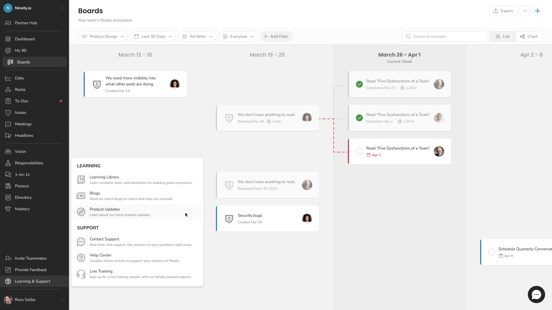 For me, the issue of workflows is always top of mind. How can we optimize a user’s workflow to align to their JTBD at that point in time, flattening the learning curve and reducing time to value? In conducting research (via observing recorded sessions, analytics funnels, reading chat support logs and, of course, talking to customers) it became painfully obvious that our users were hurting. Ninety, as it stood, did not provide much in the way of efficient workflows – if anything, we were actively reducing efficiency.