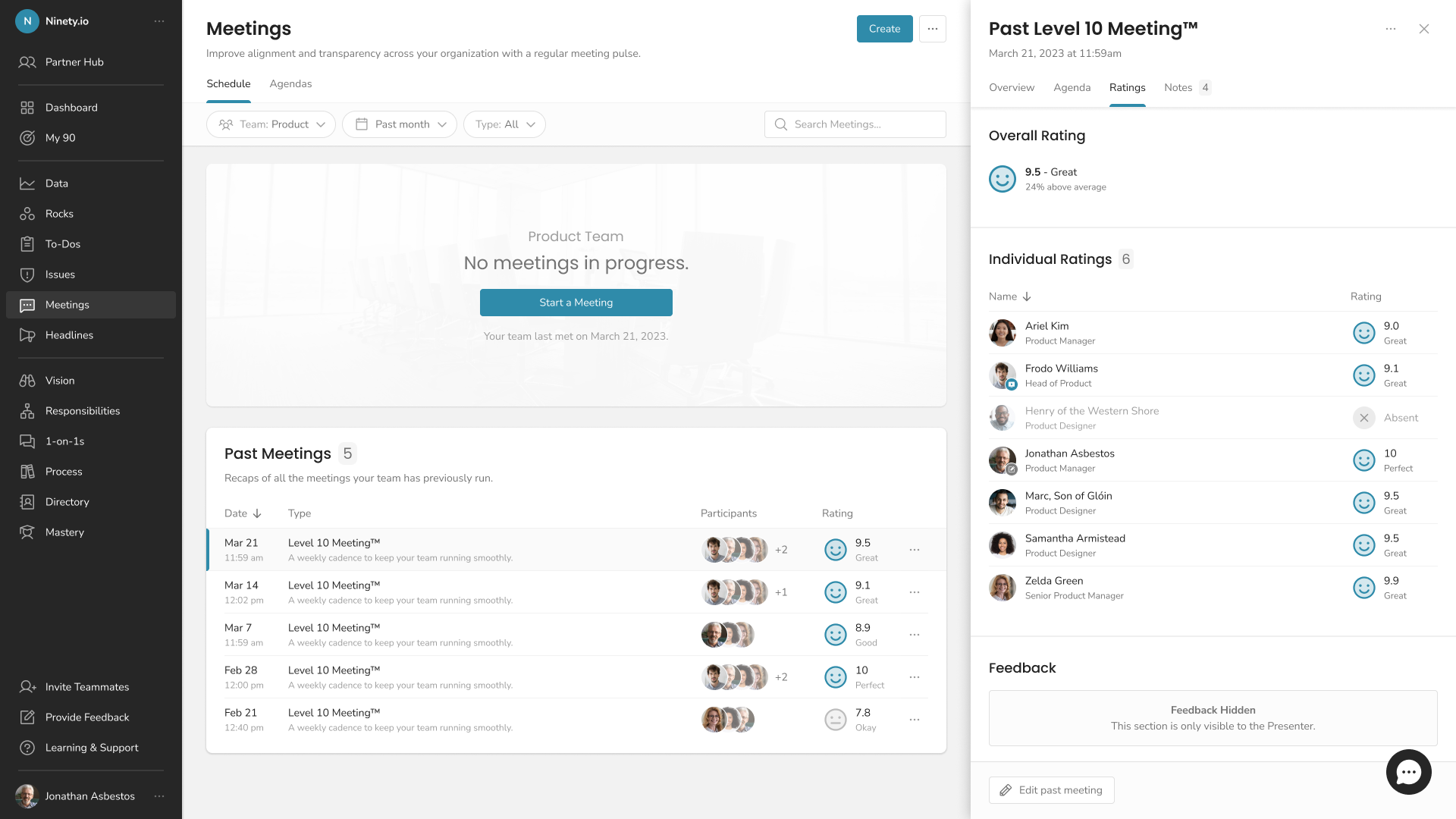 Ninety is a tool for teams. However, the concept of a 'team' is very hard to find in the UI, due to it being hidden inside the filters row within a page. There was a glaring hierarchy issue there from the start – why would a higher-level selection like a 'team' be present in a lower-level nav element? The problem was apparent, but the solution wasn't immediately clear. The team select could be relocated, but any solution the product team came up with inevitably had its downsides. It was clear that a more holistic shift was needed.