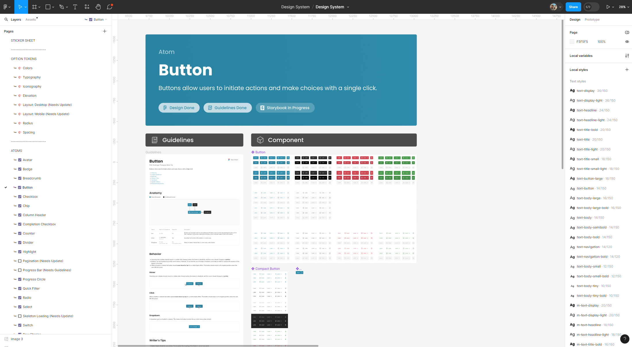This part was key – not just for designers, but for developers (especially those tasked with building out the components). For each component, I created a page structure that captured anatomy, behavior, usage guidelines, variations, update history and related components. I also set up an area to track progress on the component across three vectors – design, guidelines and Storybook. This meant that for any component someone went to in Figma, they would see designs for all the component’s variations, guidelines on how and when to use the component (in both design and in practice), and where that component was in the status of being dev-ready. Again, more work upfront for me, but gauging by how seamlessly the components are being used across design and dev, and with how few direct questions I get about usage, it was well worth the time spent.