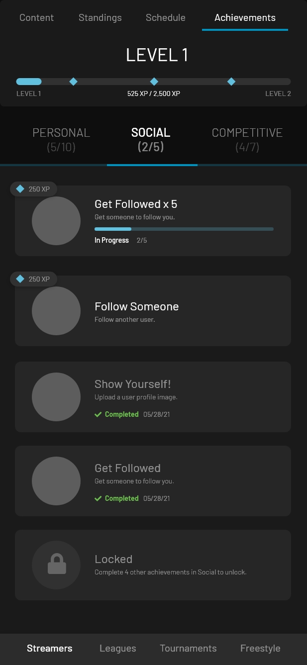 With a good sense of who were were building for, and what features we wanted for MVP, it was time to design. We agreed that the KOTH model was still the best bet for initial adoption – gamers who wanted a sense of community, had a desire to stream and get some views, but weren't necessarily getting that from Twitch. Dev was still in the process of nailing down the tech stack, which gave me some breathing room. I took the opportunity to build out a UI kit in Figma, including color and typography tokens and some basic components. This made sure any hi-fi designs going forward used a consistent visual language, reducing design debt down the line.