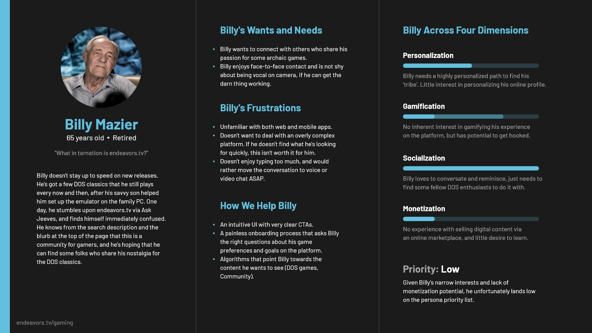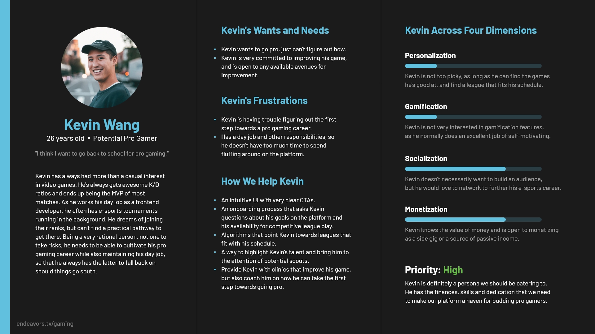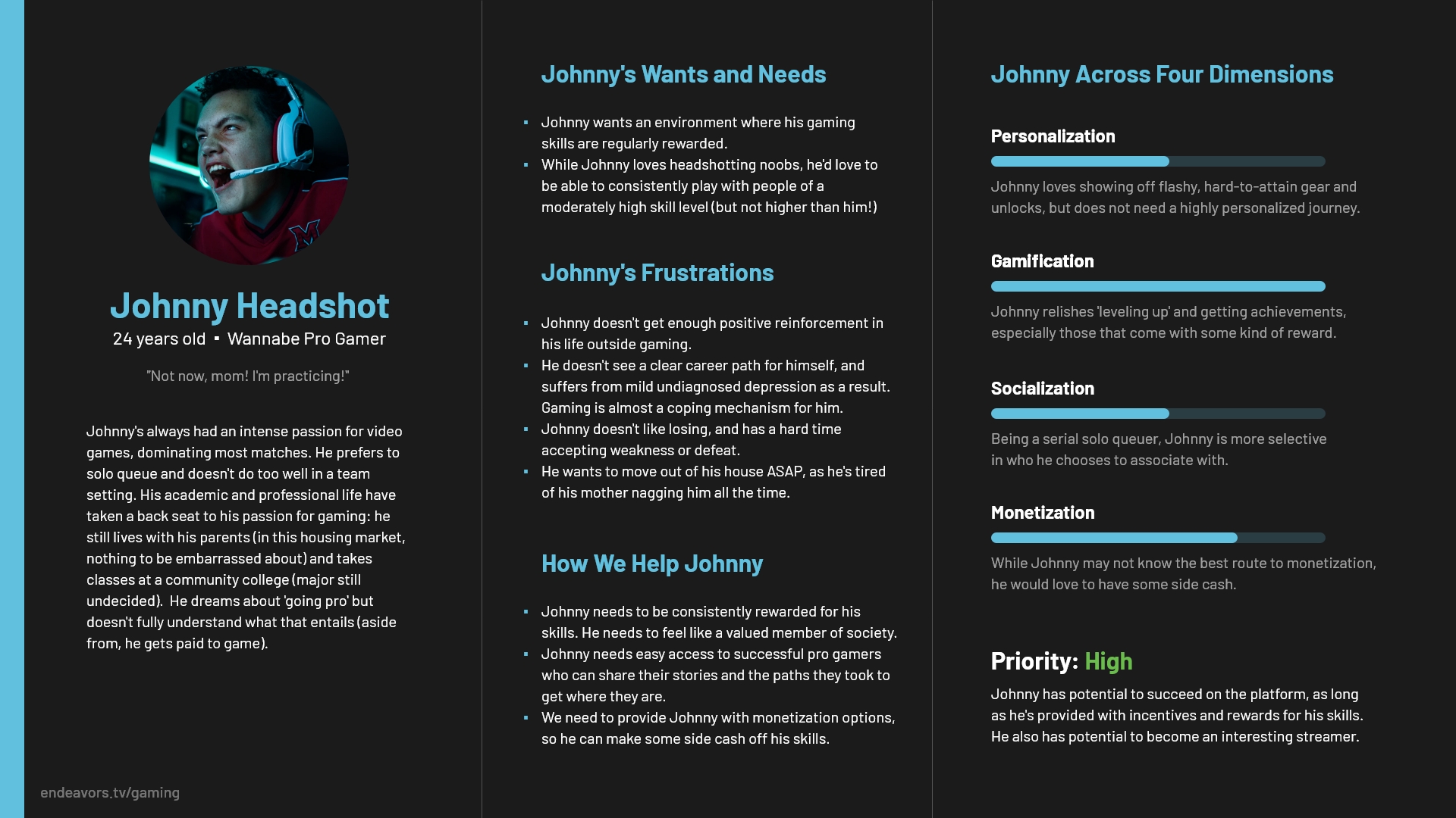 The four pillars segued very neatly into persona development: they allowed us to focus our research on specific themes. That being said, our capacity for research was limited – we all worked full-time jobs, and a lot of us, believe it or not, had personal lives. We took the leanest possible approach to persona development – an incentivized survey sent out via Reddit and Discord, triangulated with qualitative data from Reddit research (lucky for us, a large chunk of our ICP also happened to be active on Reddit). Once we had some data points, I synthesized the findings into a set of personas that combined demographic and psychographic data with that segment's hypothetical scores across the pillars. How much does this persona care about a personalized experience? Are they a lone wolf, or are they looking for a pack? Are they looking to build an e-sports career, or are they just here to have fun? These were some of the questions the pillars aimed to quantify.