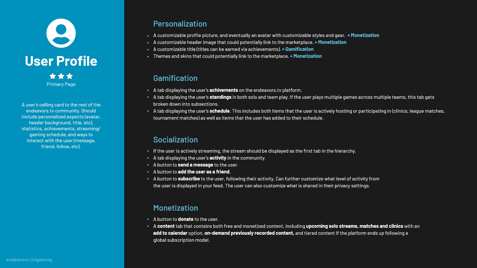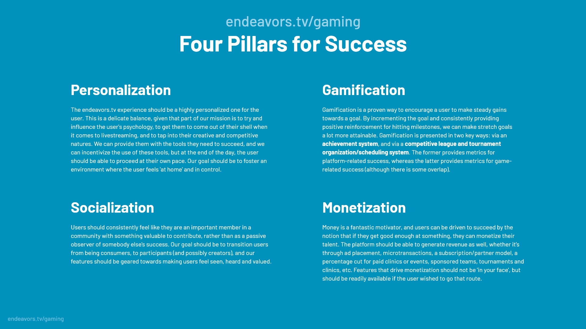 The pillars for success, meant to be the foundation of Endeavors.tv's product strategy.
