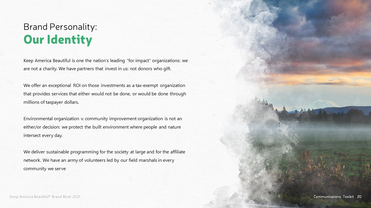 A selection of pages from the new brand book, which outlines the organization’s mission, values and goals, and provides guidelines for implementing the new visual identity:
